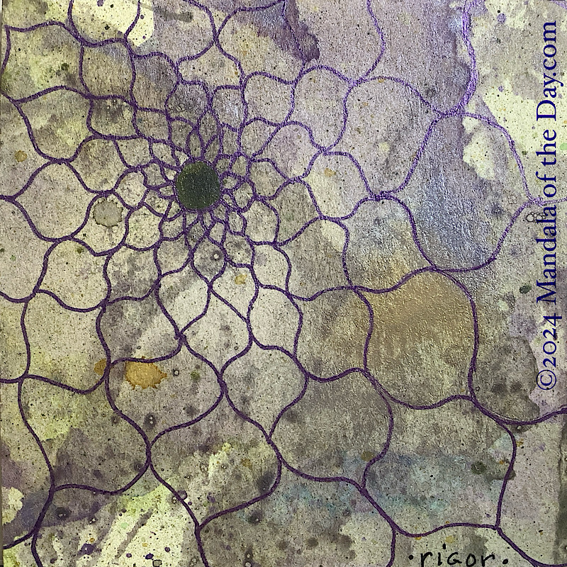 Where I mostly apply rigor these days is with creating the 4’x4’ mandalas for the Archangel series, which will end up being 7 Tibetan-styled mandalas representing Archangels who only want to be called by their order number. While my other styles of mandala designs allow for some looseness, the Tibetan style requires precision otherwise it throws off the whole design. And at such a large scale, it usually takes about 4-6 hours over a couple of days just to outline the basic shape of it…the details come later, row by row, section by section.