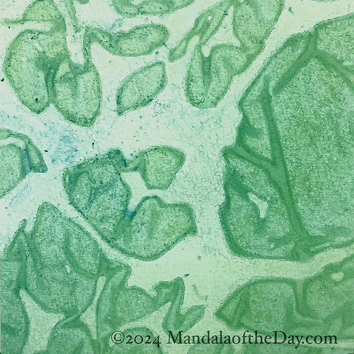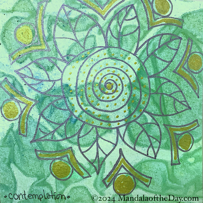 When I look at this mandala, I can see where it encourages us to go inward to find the “gold”. The leaves around the outside make me think of the noise they make when wind goes through them. The v-shapes with circles look like people cheering. I’d like to think that’s our team of guides and angels cheering us on as we go inwards…away from the noise…because that’s when we’re more likely to hear their guidance and insight.