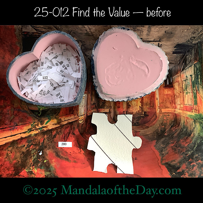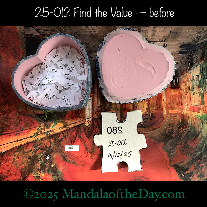 BTWā¦Hereās the beforeā¦the front and back view of todayās puzzle piece and the pretty ceramic box that holds all my numbers from which I randomly choose each dayās puzzle piece number: