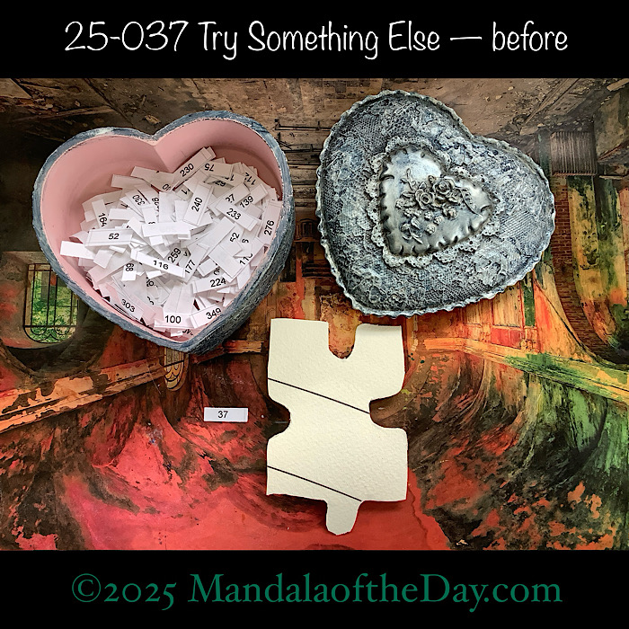 BTW…Here’s the before…the front and back view of today’s puzzle piece and the pretty ceramic box that holds all my numbers from which I randomly choose each day’s puzzle piece number: