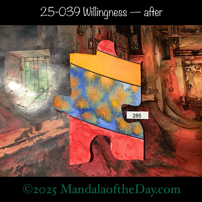 Throughout the year, I’ll be building one large (48”x48”) Tibetan-styled Mandala one piece at a time…one puzzle piece at a time, that is. The mandala design and the reversed puzzle side were printed on artist-quality watercolor paper. The forward facing puzzle side was printed on a 48”x48” wood panel.
