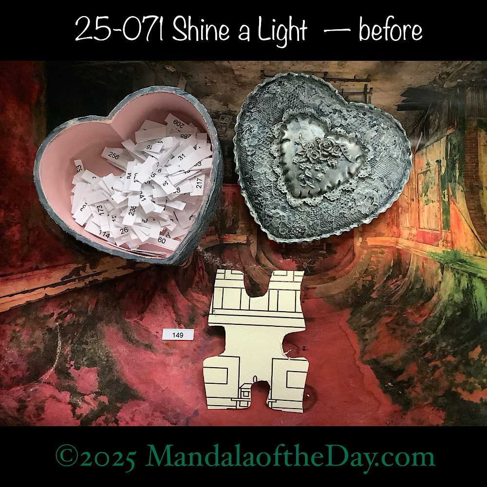 BTW…Here’s the before…the front and back view of today’s puzzle piece and the pretty ceramic box that holds all my numbers from which I randomly choose each day’s puzzle piece number: