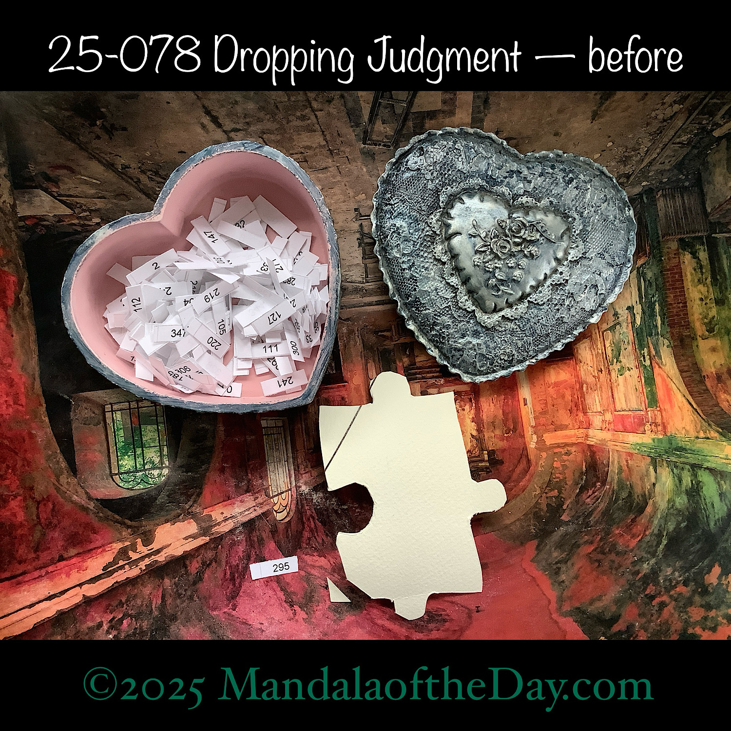 BTW…Here’s the before…the front and back view of today’s puzzle piece and the pretty ceramic box that holds all my numbers from which I randomly choose each day’s puzzle piece number: