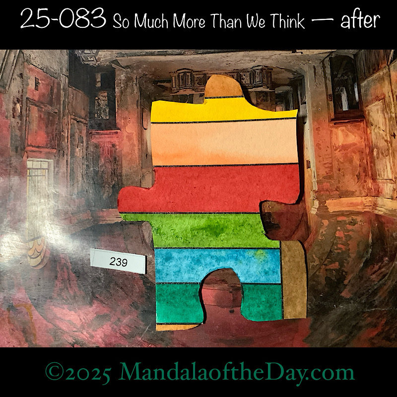 Throughout the year, I’ll be building one large (48”x48”) Tibetan-styled Mandala one piece at a time…one puzzle piece at a time, that is. The mandala design and the reversed puzzle side were printed on artist-quality watercolor paper. The forward facing puzzle side was printed on a 48”x48” wood panel.