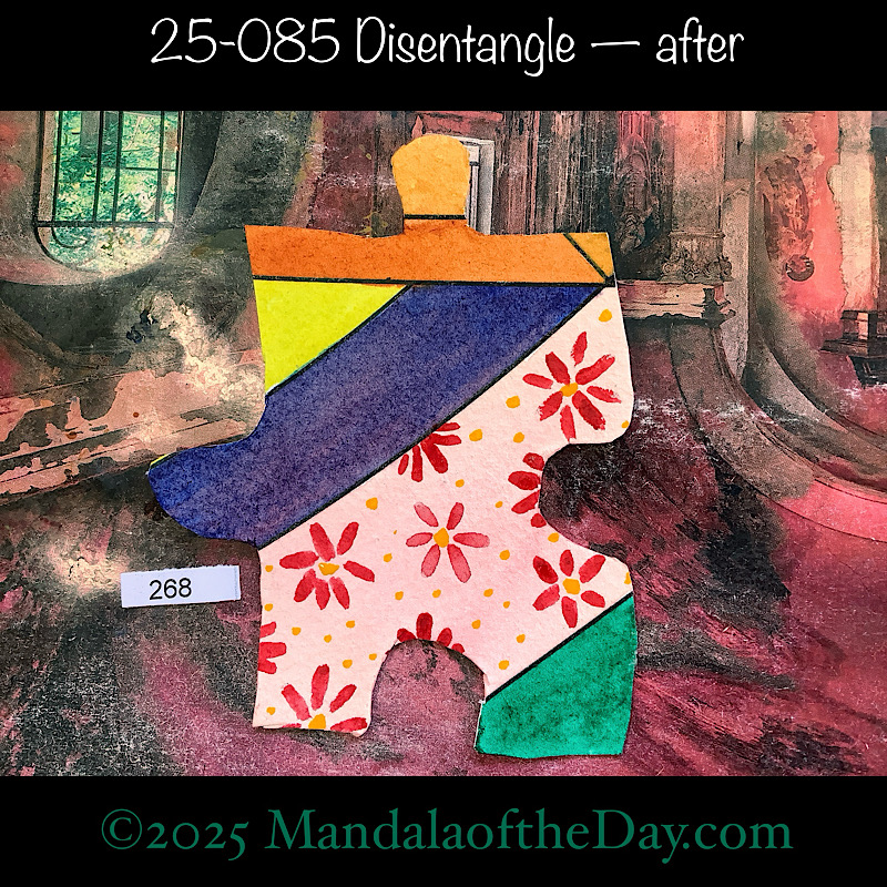Throughout the year, I’ll be building one large (48”x48”) Tibetan-styled Mandala one piece at a time…one puzzle piece at a time, that is. The mandala design and the reversed puzzle side were printed on artist-quality watercolor paper. The forward facing puzzle side was printed on a 48”x48” wood panel.