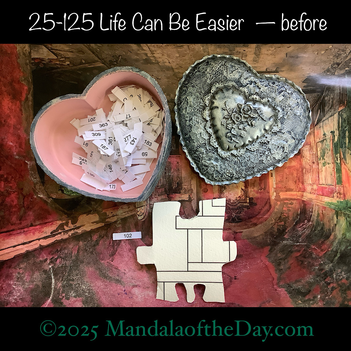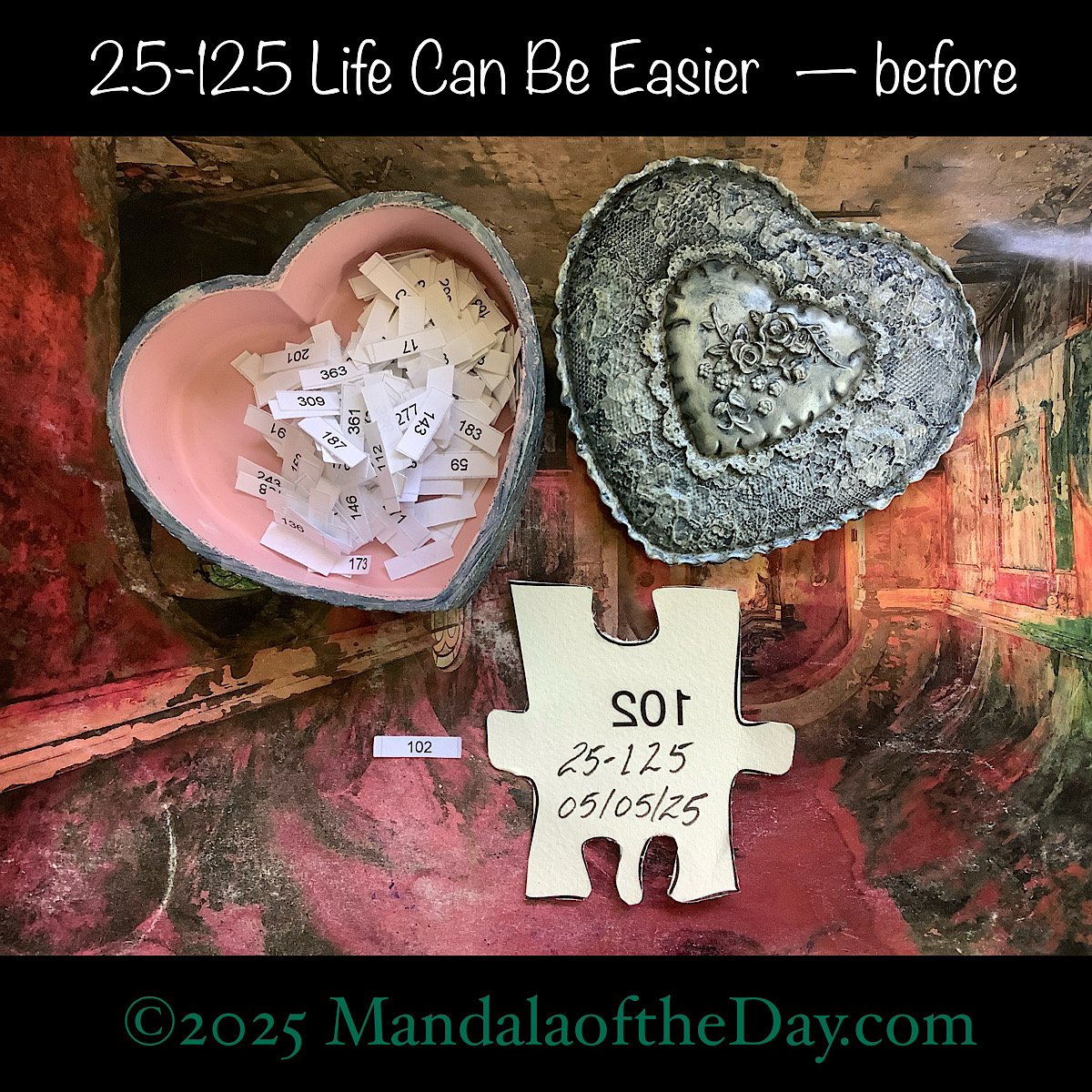 BTW…Here’s the before…the front and back view of today’s puzzle piece and the pretty ceramic box that holds all my numbers from which I randomly choose each day’s puzzle piece number: