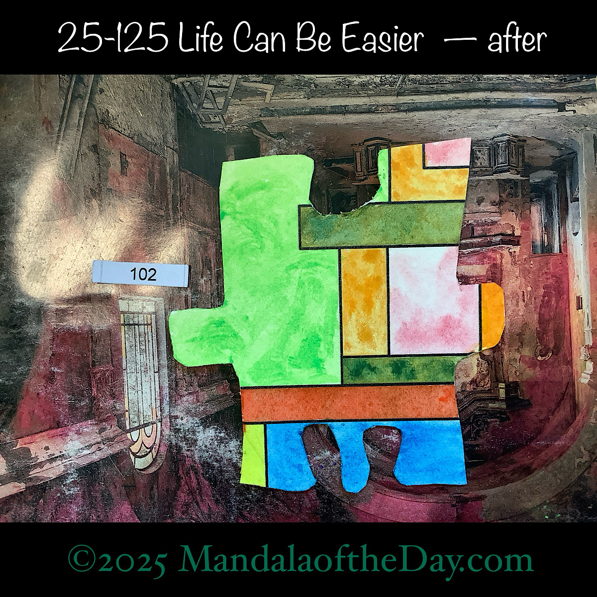 Throughout the year, I’ll be building one large (48”x48”) Tibetan-styled Mandala one piece at a time…one puzzle piece at a time, that is. The mandala design and the reversed puzzle side were printed on artist-quality watercolor paper. The forward facing puzzle side was printed on a 48”x48” wood panel.