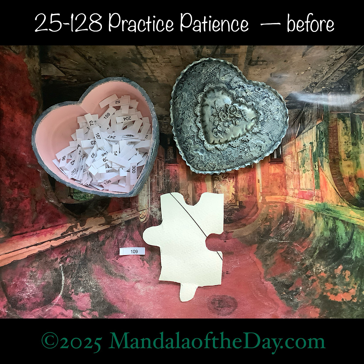 BTW…Here’s the before…the front and back view of today’s puzzle piece and the pretty ceramic box that holds all my numbers from which I randomly choose each day’s puzzle piece number: