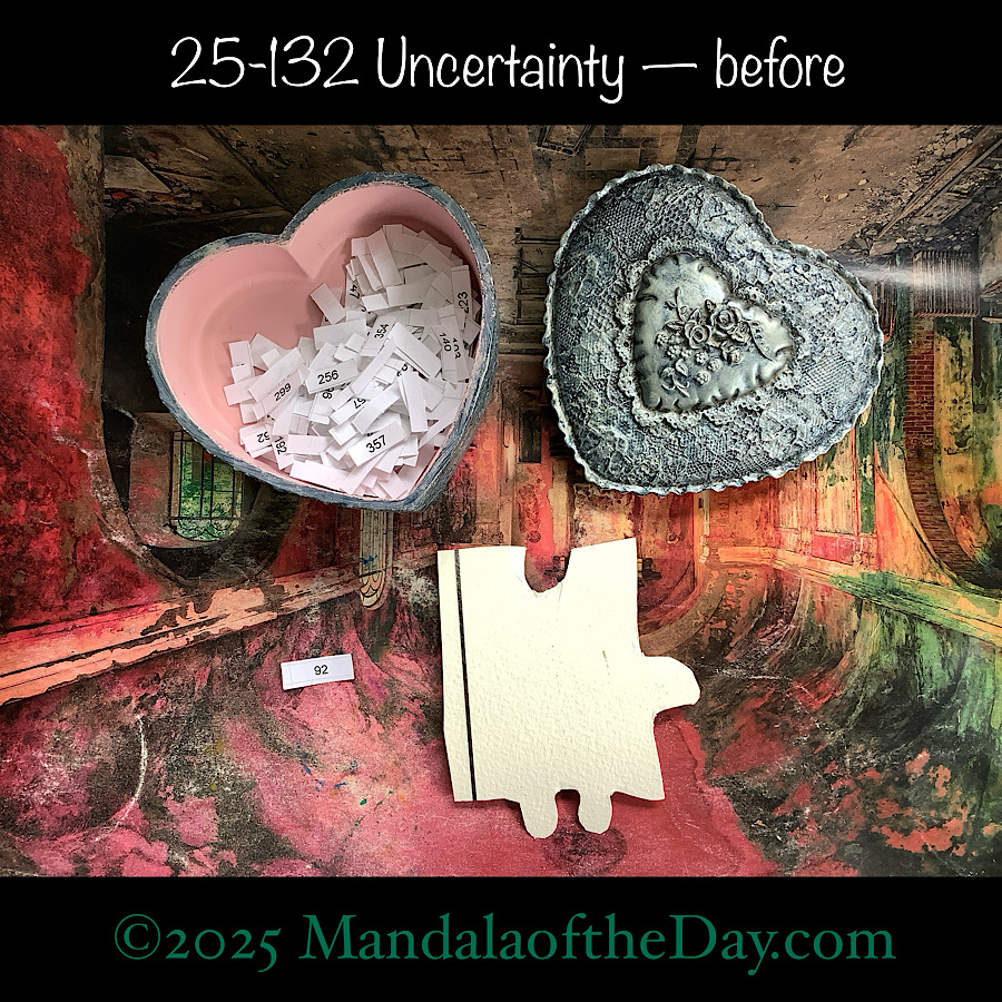 Throughout the year, I’ll be building one large (48”x48”) Tibetan-styled Mandala one piece at a time…one puzzle piece at a time, that is. The mandala design and the reversed puzzle side were printed on artist-quality watercolor paper. The forward facing puzzle side was printed on a 48”x48” wood panel.