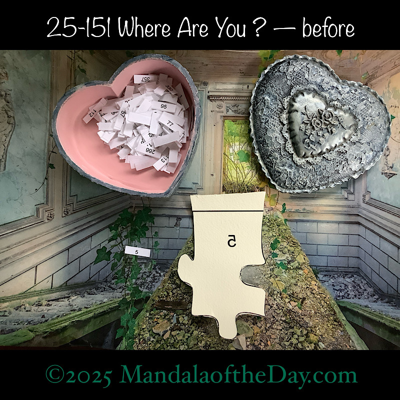 BTW…Here’s the before…the front and back view of today’s puzzle piece and the pretty ceramic box that holds all my numbers from which I randomly choose each day’s puzzle piece number:
