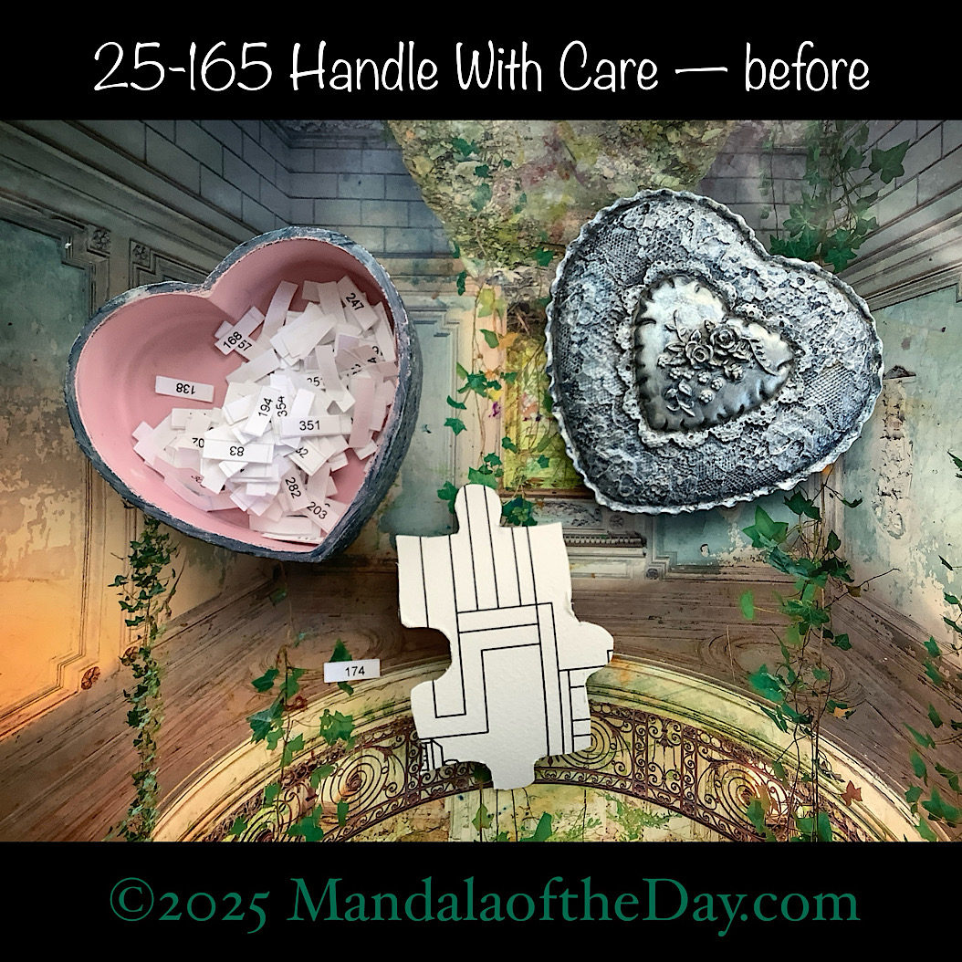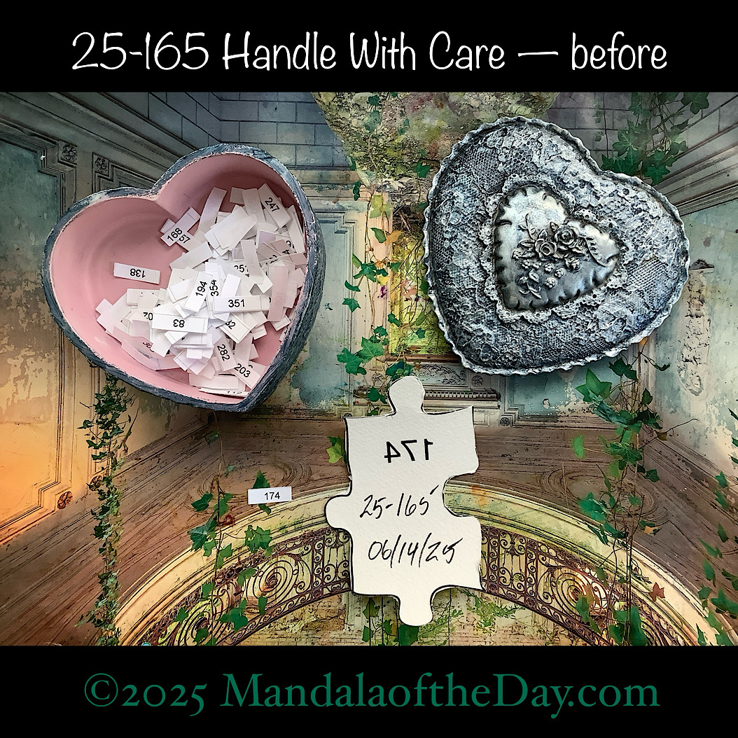 BTW…Here’s the before…the front and back view of today’s puzzle piece and the pretty ceramic box that holds all my numbers from which I randomly choose each day’s puzzle piece number: