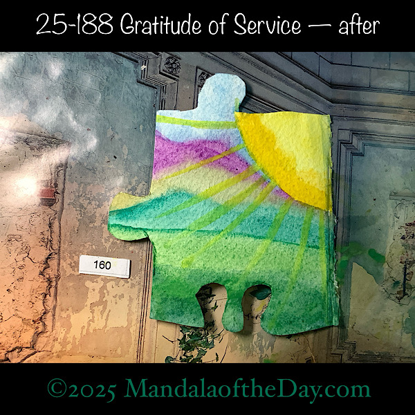 Throughout the year, I’ll be building one large (48”x48”) Tibetan-styled Mandala one piece at a time…one puzzle piece at a time, that is. The mandala design and the reversed puzzle side were printed on artist-quality watercolor paper. The forward facing puzzle side was printed on a 48”x48” wood panel.