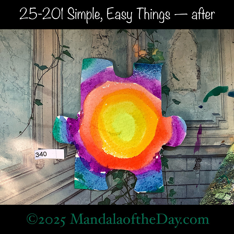 Throughout the year, I’ll be building one large (48”x48”) Tibetan-styled Mandala one piece at a time…one puzzle piece at a time, that is. The mandala design and the reversed puzzle side were printed on artist-quality watercolor paper. The forward facing puzzle side was printed on a 48”x48” wood panel.