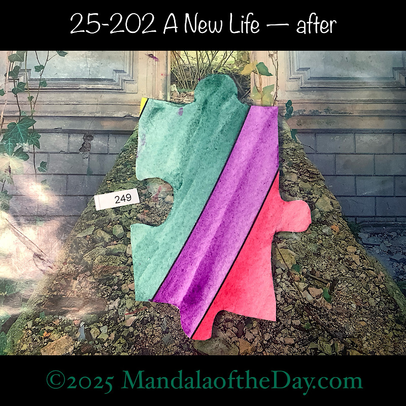 Throughout the year, I’ll be building one large (48”x48”) Tibetan-styled Mandala one piece at a time…one puzzle piece at a time, that is. The mandala design and the reversed puzzle side were printed on artist-quality watercolor paper. The forward facing puzzle side was printed on a 48”x48” wood panel.