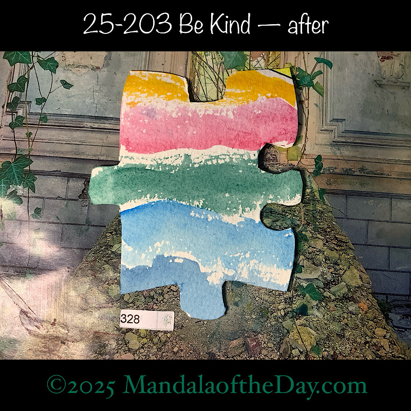 Throughout the year, I’ll be building one large (48”x48”) Tibetan-styled Mandala one piece at a time…one puzzle piece at a time, that is. The mandala design and the reversed puzzle side were printed on artist-quality watercolor paper. The forward facing puzzle side was printed on a 48”x48” wood panel.