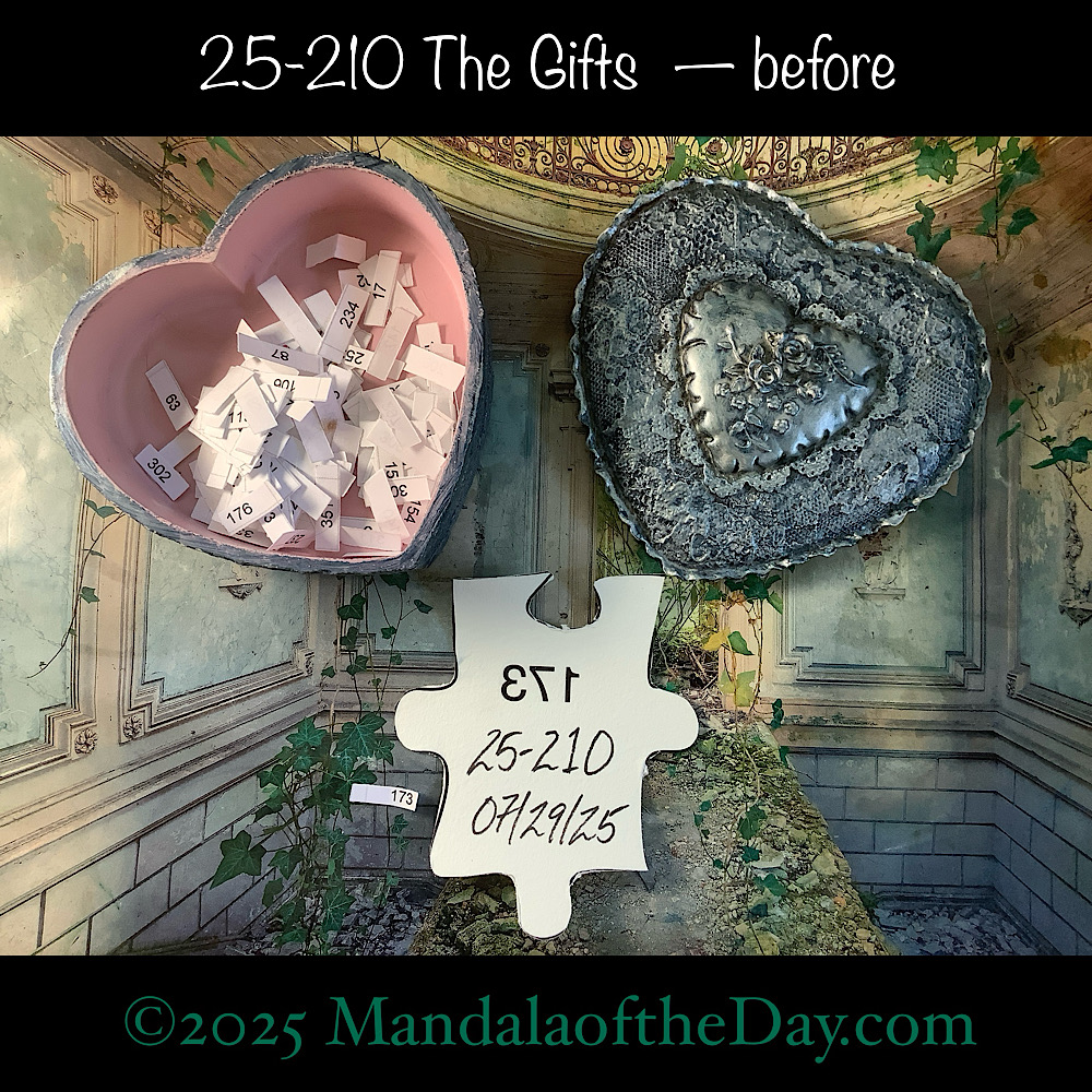 BTW…Here’s the before…the front and back view of today’s puzzle piece and the pretty ceramic box that holds all my numbers from which I randomly choose each day’s puzzle piece number: