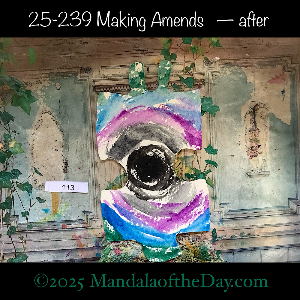 Throughout the year, I’ll be building one large (48”x48”) Tibetan-styled Mandala one piece at a time…one puzzle piece at a time, that is. The mandala design and the reversed puzzle side were printed on artist-quality watercolor paper. The forward facing puzzle side was printed on a 48”x48” wood panel.