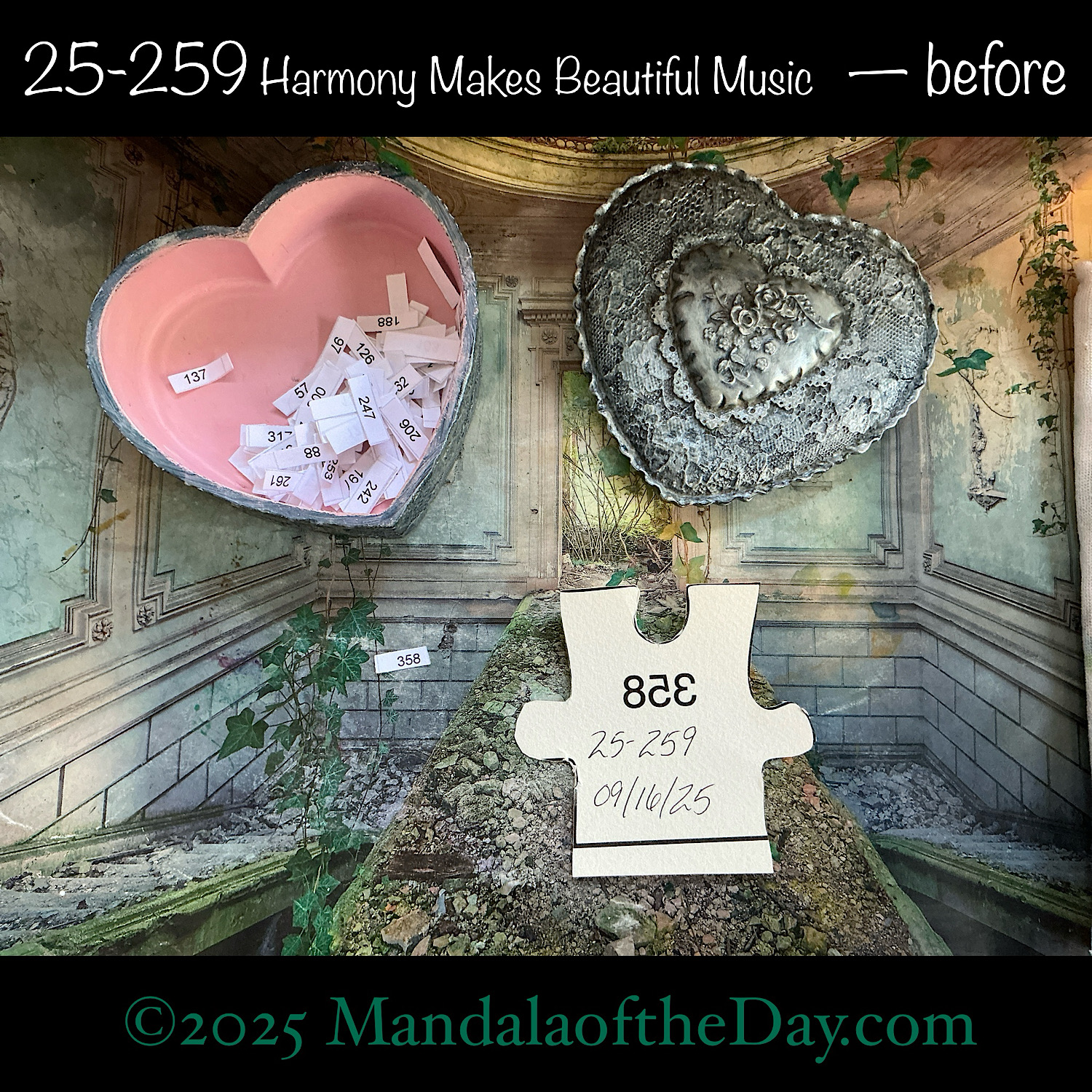 BTW…Here’s the before…the front and back view of today’s puzzle piece and the pretty ceramic box that holds all my numbers from which I randomly choose each day’s puzzle piece number: