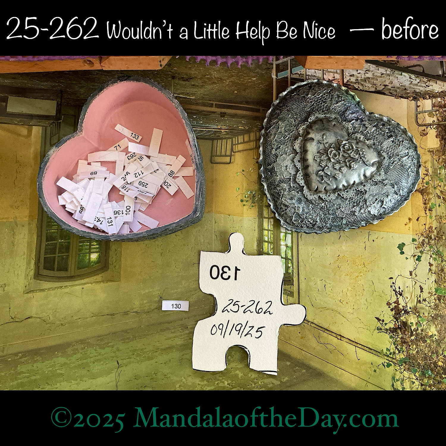 BTW…Here’s the before…the front and back view of today’s puzzle piece and the pretty ceramic box that holds all my numbers from which I randomly choose each day’s puzzle piece number: