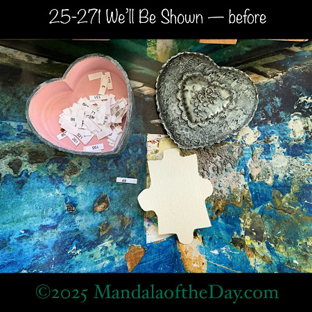 BTW…Here’s the before…the front and back view of today’s puzzle piece and the pretty ceramic box that holds all my numbers from which I randomly choose each day’s puzzle piece number:
