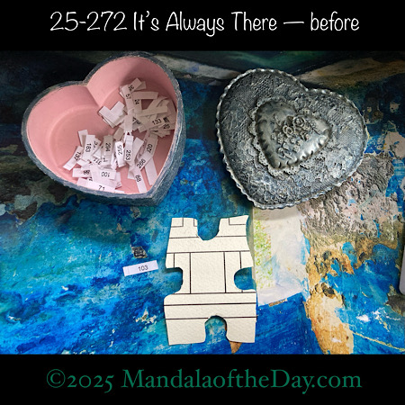 BTW…Here’s the before…the front and back view of today’s puzzle piece and the pretty ceramic box that holds all my numbers from which I randomly choose each day’s puzzle piece number: