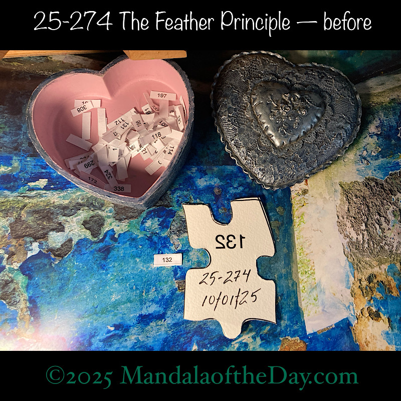 BTW…Here’s the before…the front and back view of today’s puzzle piece and the pretty ceramic box that holds all my numbers from which I randomly choose each day’s puzzle piece number: