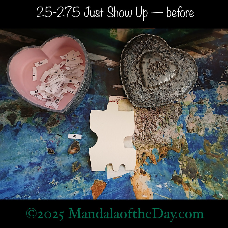 BTW…Here’s the before…the front and back view of today’s puzzle piece and the pretty ceramic box that holds all my numbers from which I randomly choose each day’s puzzle piece number: