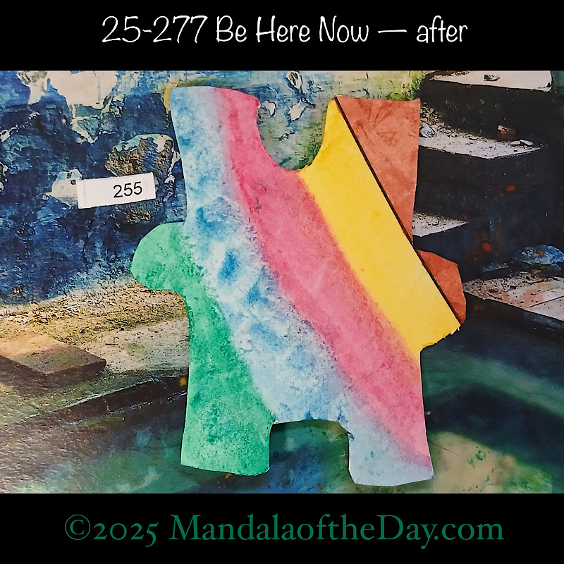 Throughout the year, I’ll be building one large (48”x48”) Tibetan-styled Mandala one piece at a time…one puzzle piece at a time, that is. The mandala design and the reversed puzzle side were printed on artist-quality watercolor paper. The forward facing puzzle side was printed on a 48”x48” wood panel.