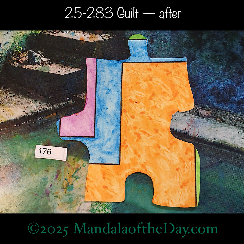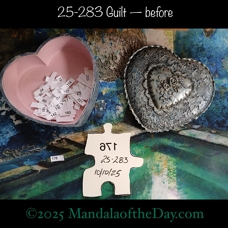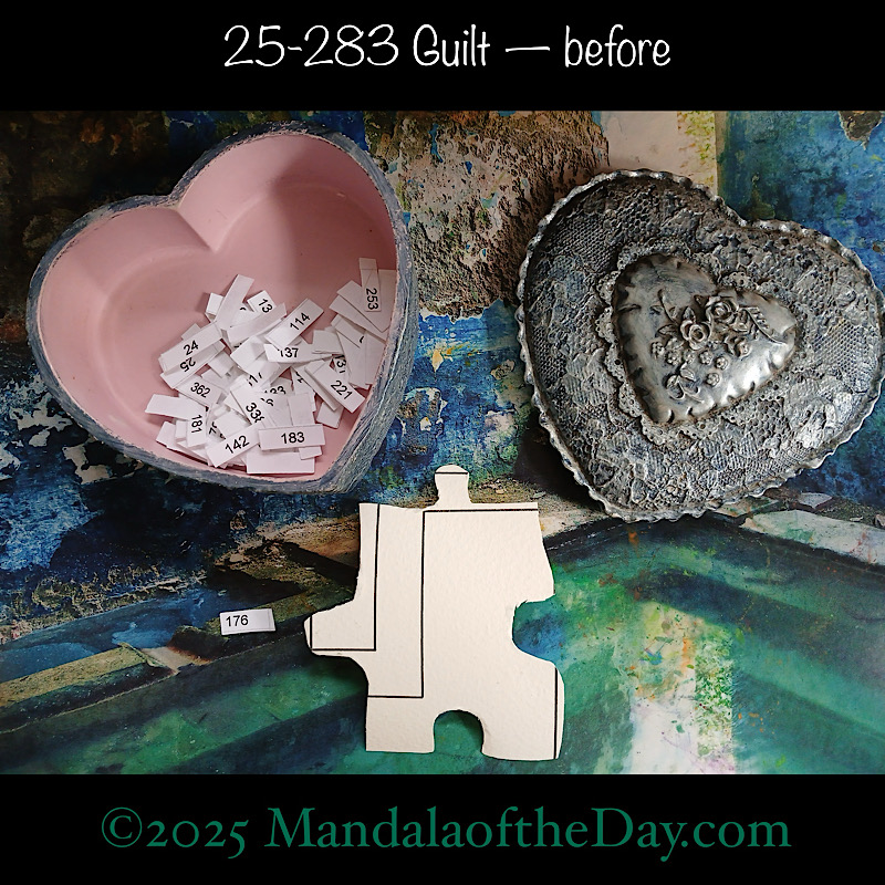 BTW…Here’s the before…the front and back view of today’s puzzle piece and the pretty ceramic box that holds all my numbers from which I randomly choose each day’s puzzle piece number:
