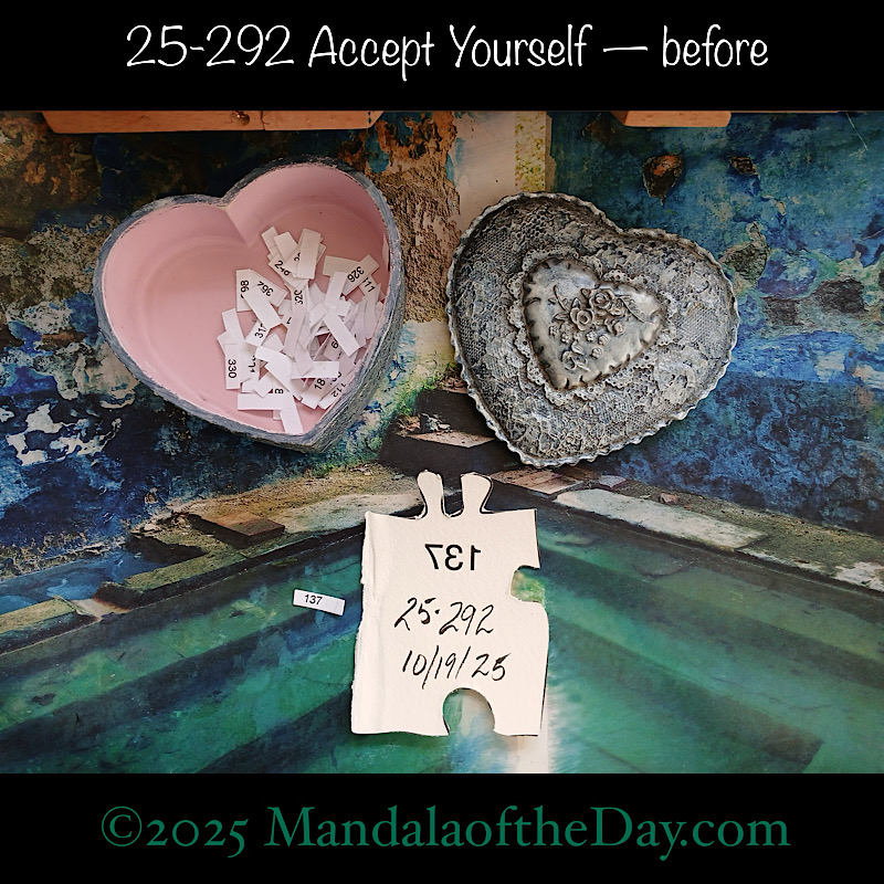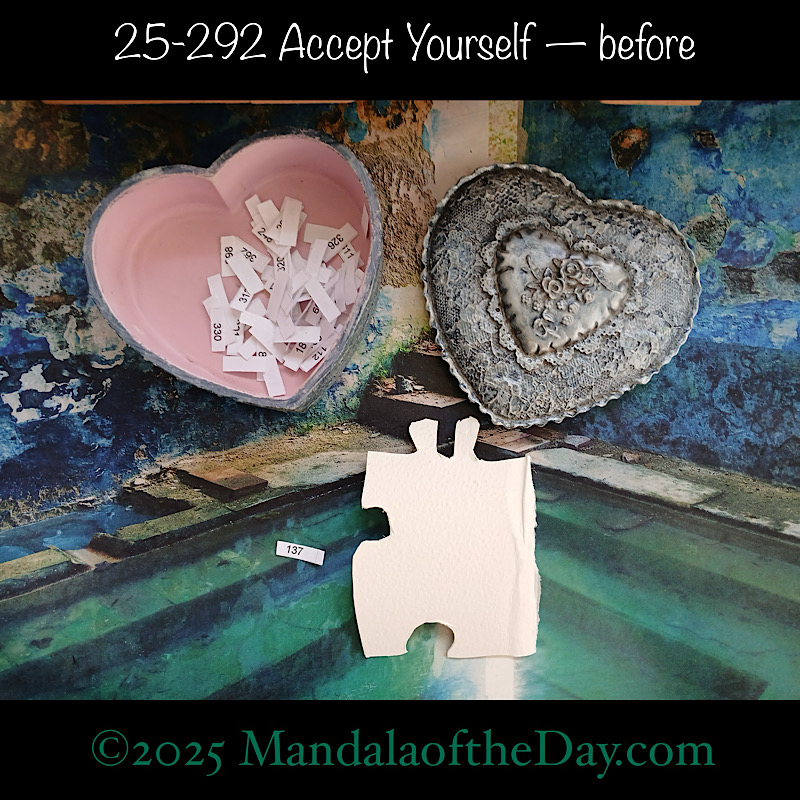 BTW…Here’s the before…the front and back view of today’s puzzle piece and the pretty ceramic box that holds all my numbers from which I randomly choose each day’s puzzle piece number: