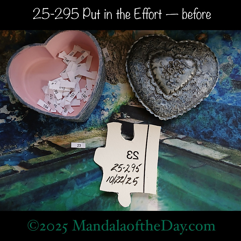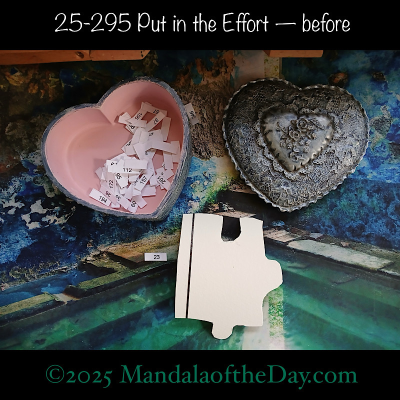 BTW…Here’s the before…the front and back view of today’s puzzle piece and the pretty ceramic box that holds all my numbers from which I randomly choose each day’s puzzle piece number:
