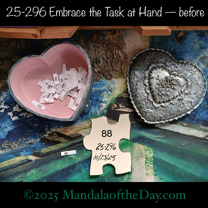 BTW…Here’s the before…the front and back view of today’s puzzle piece and the pretty ceramic box that holds all my numbers from which I randomly choose each day’s puzzle piece number: