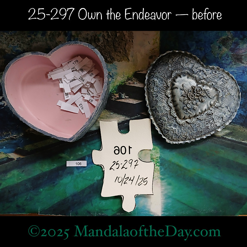 BTW…Here’s the before…the front and back view of today’s puzzle piece and the pretty ceramic box that holds all my numbers from which I randomly choose each day’s puzzle piece number: