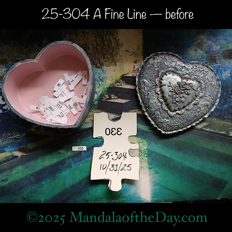BTW…Here’s the before…the front and back view of today’s puzzle piece and the pretty ceramic box that holds all my numbers from which I randomly choose each day’s puzzle piece number: