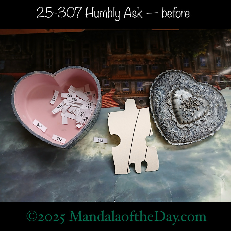 BTW…Here’s the before…the front and back view of today’s puzzle piece and the pretty ceramic box that holds all my numbers from which I randomly choose each day’s puzzle piece number: