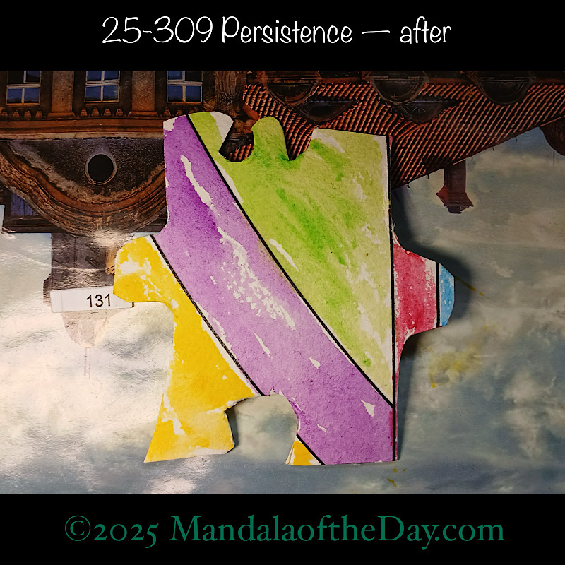 Throughout the year, I’ll be building one large (48”x48”) Tibetan-styled Mandala one piece at a time…one puzzle piece at a time, that is. The mandala design and the reversed puzzle side were printed on artist-quality watercolor paper. The forward facing puzzle side was printed on a 48”x48” wood panel.