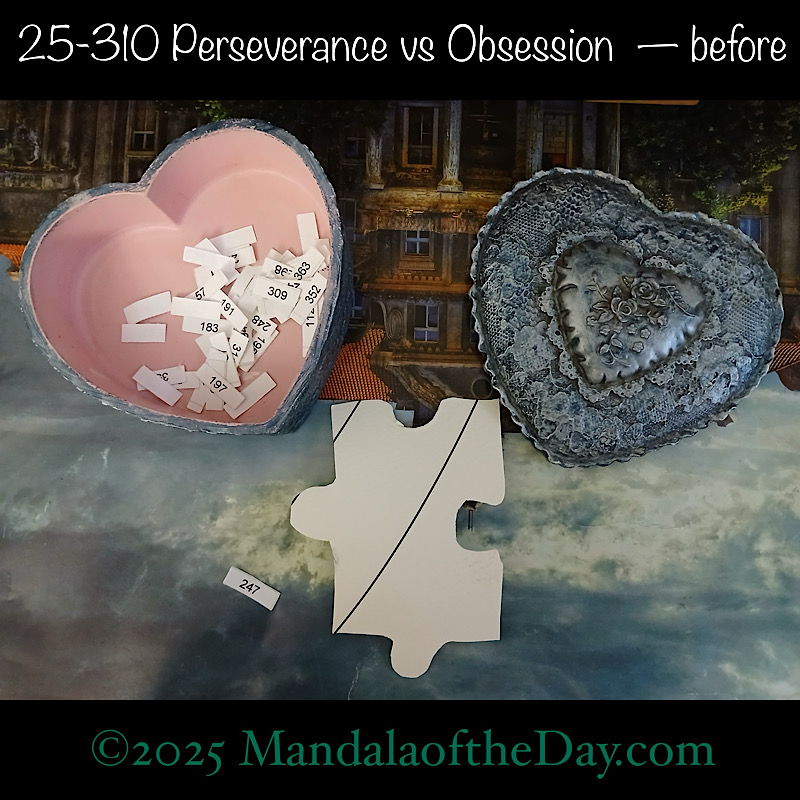BTW…Here’s the before…the front and back view of today’s puzzle piece and the pretty ceramic box that holds all my numbers from which I randomly choose each day’s puzzle piece number: