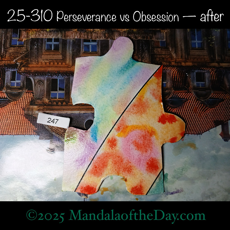 Throughout the year, I’ll be building one large (48”x48”) Tibetan-styled Mandala one piece at a time…one puzzle piece at a time, that is. The mandala design and the reversed puzzle side were printed on artist-quality watercolor paper. The forward facing puzzle side was printed on a 48”x48” wood panel.