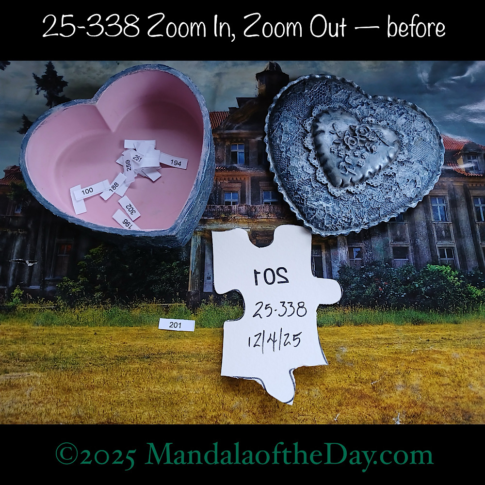 BTW…Here’s the before…the front and back view of today’s puzzle piece and the pretty ceramic box that holds all my numbers from which I randomly choose each day’s puzzle piece number: