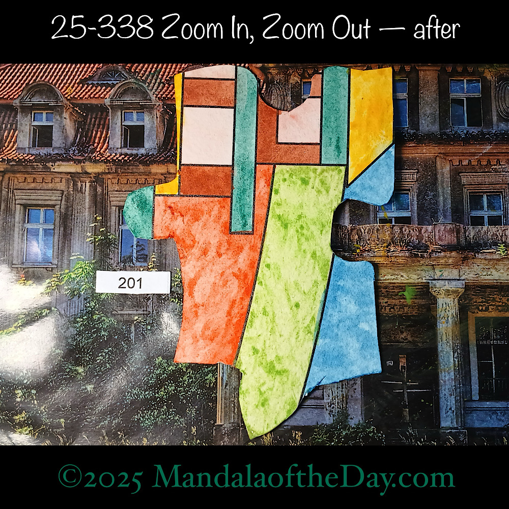 Throughout the year, I’ll be building one large (48”x48”) Tibetan-styled Mandala one piece at a time…one puzzle piece at a time, that is. The mandala design and the reversed puzzle side were printed on artist-quality watercolor paper. The forward facing puzzle side was printed on a 48”x48” wood panel.