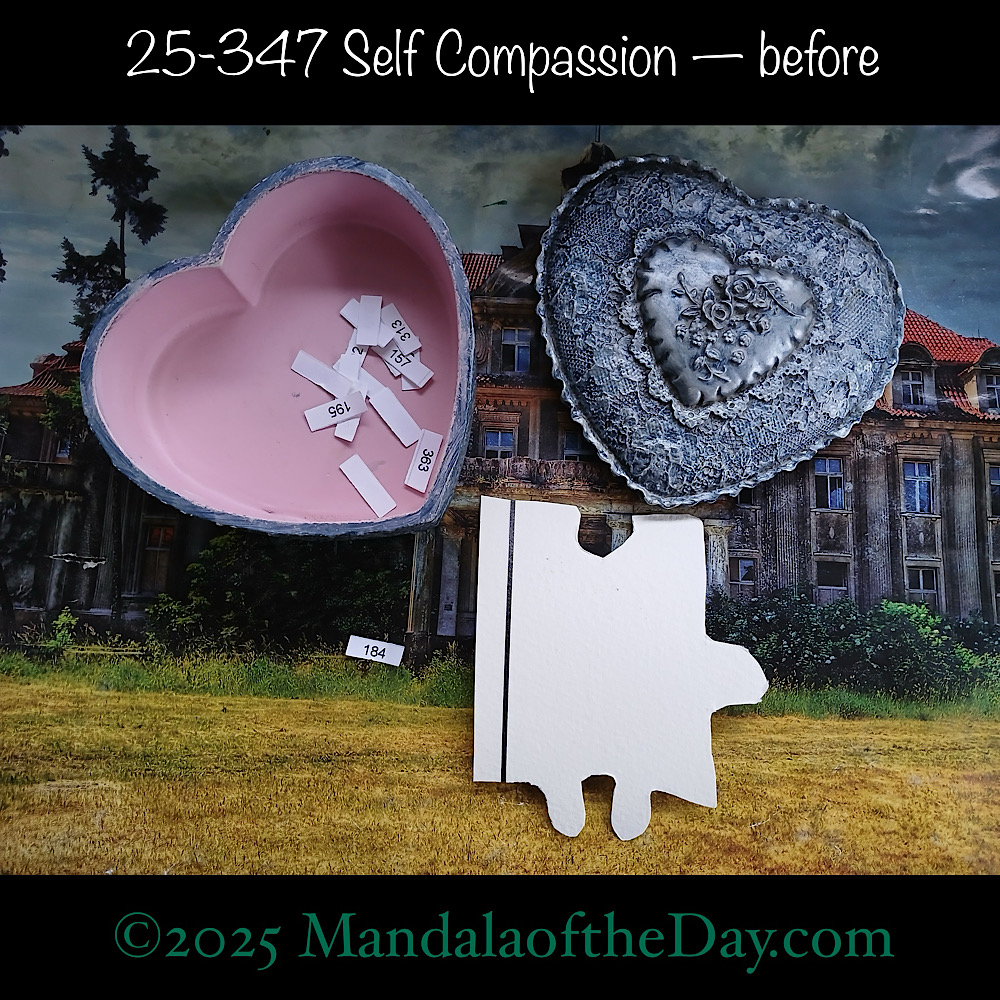 BTW…Here’s the before…the front and back view of today’s puzzle piece and the pretty ceramic box that holds all my numbers from which I randomly choose each day’s puzzle piece number: