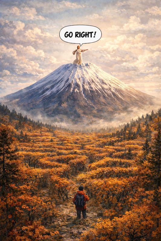 I see a mountain peak, similar to a snow-capped Mount Fuji. At the base and all around the mountain, a maze of trees forms a dense forest. Somewhere within that forest, a single person walks—uncertain, surrounded, unsure which way to go. High above, at the summit, another person stands as a lookout. Arm extended and pointing firmly to the right, their voice carries down through the mountain air: “Go right!” And somewhere below, the confused traveler hears it and now knows which way to go.